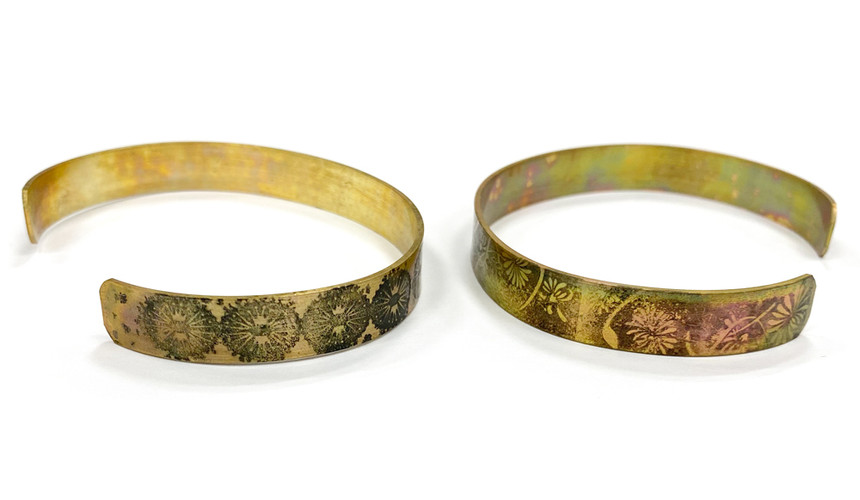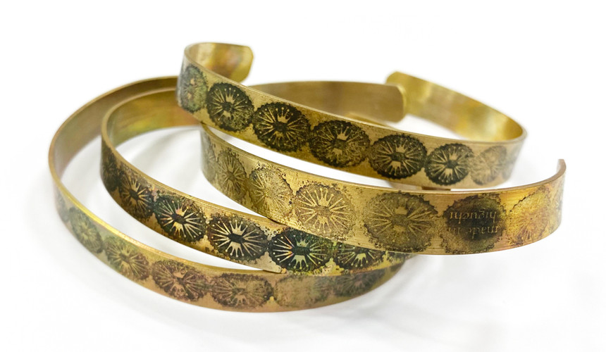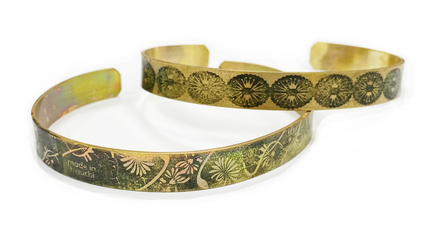 今回は、サックスなどの管楽器と同じ真鍮を素材に、オリジナルの総柄を電解マーキングしてバングルをつくりました。メッキ加工されていない本物の金属のため、時間の経過と共に絵柄が擦れたり本体が変色したり、全体のアンティーク感が増してきます。ぜひ変化をお愉しみくだ